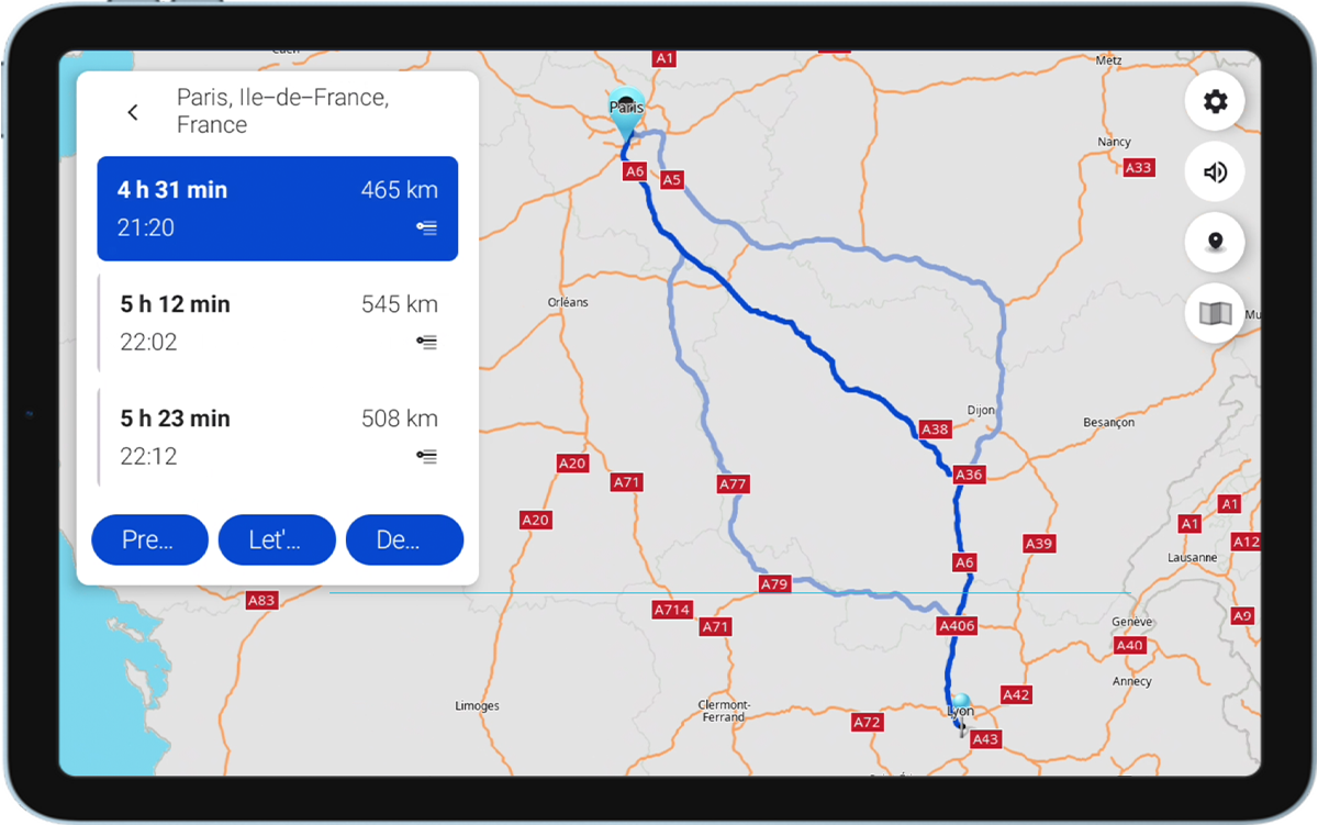BeNav displays multiple vehicle-compliant routes for each destination—automatically filtered to avoid road restrictions and access bans. Give your drivers clear, regulation-friendly options without manual guesswork, so they can stay efficient and on schedule.